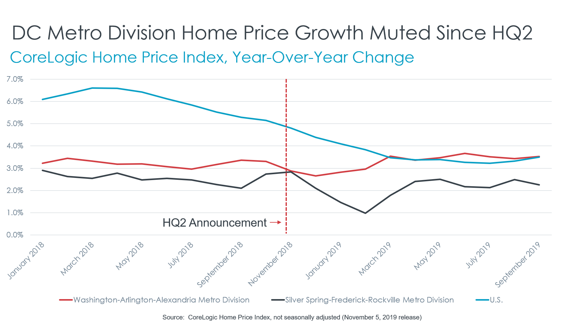 Regional Home Price Growth Since the HQ2 Announcement MutedThe impact of Amazon choosing the district housing market (which includes both the Washington-Arlington-Alexandria and Silver Spring-Frederick-Rockville metro divisions) for the location of their HQ2 is unclear at best. Looking at the year-over-year change in the monthly CoreLogic Home Price Index (HPI), the data shows that both metro divisions saw little change in the rate of appreciation after November 2018. In September 2018 (the most recent comparison month between 2018 and 2019), annual home price growth in the Washington-Arlington-Alexandria and Silver Spring-Frederick-Rockville metro divisions rested at 3.4% and 2.1%, respectively, but grew slightly to 3.5% and 2.3% by September 2019. This is hardly what one would call a "boom."
