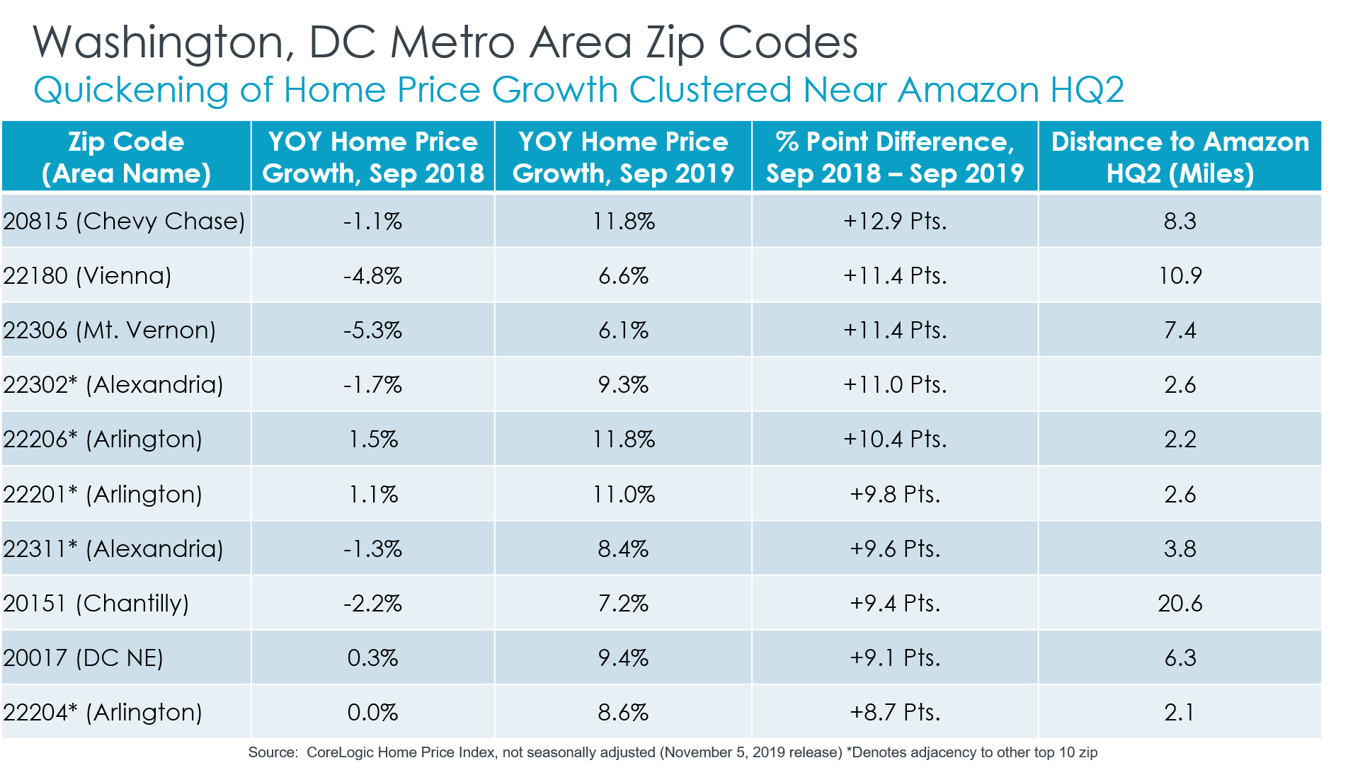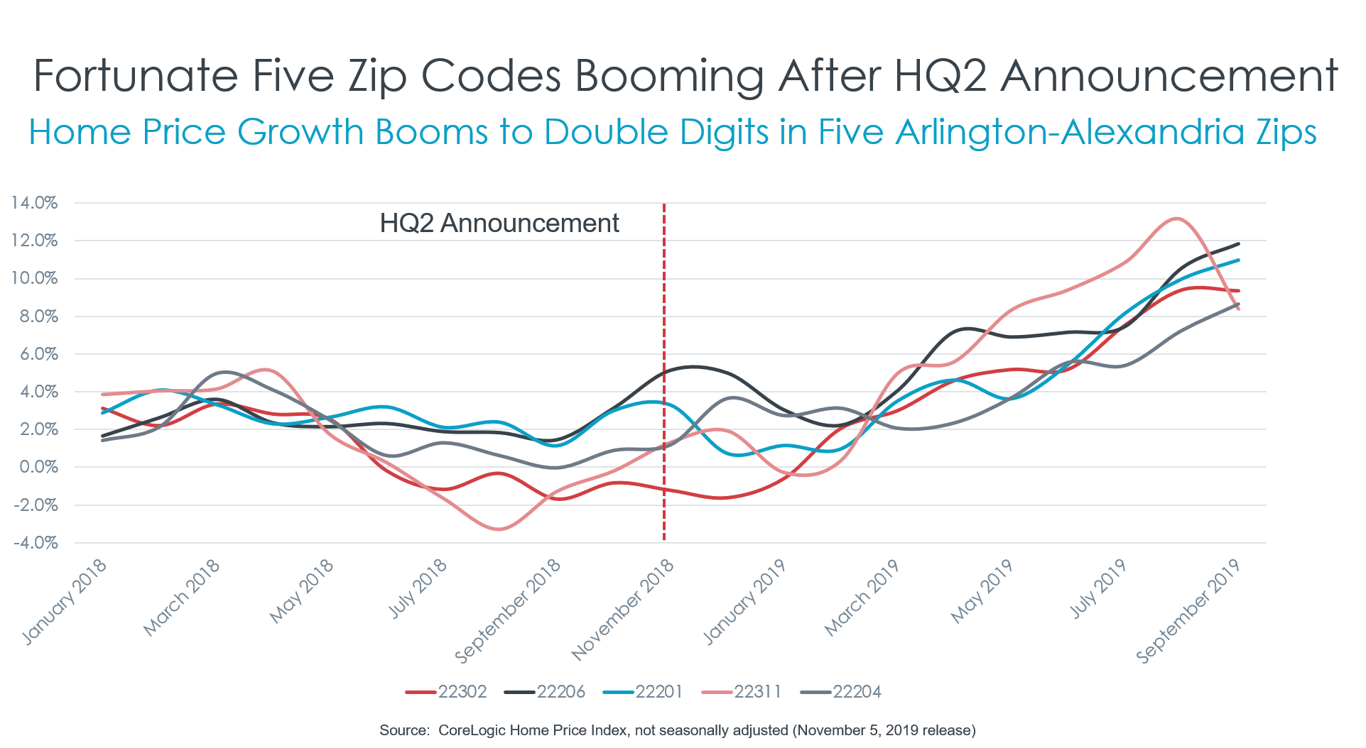 Second, and in contrast, some individual zip codes - especially those near the HQ2 location - have had a strong uptick in price gains since the announcement.