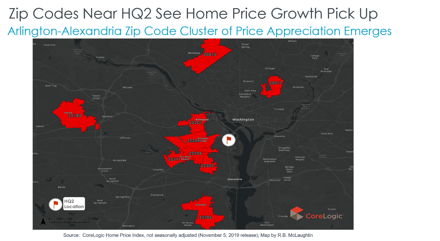 Mr. McLaughlin concludes, "While we don't know precisely how the placement of a large corporate headquarters into a region affects a housing market, our work looking back on the first year of HQ2 suggests the potential for large upward swings in home prices near the chosen site. What's more, the impact appears to take hold rather quickly, as investors and owner-occupiers bid-up home prices in anticipation of future tangible demand."