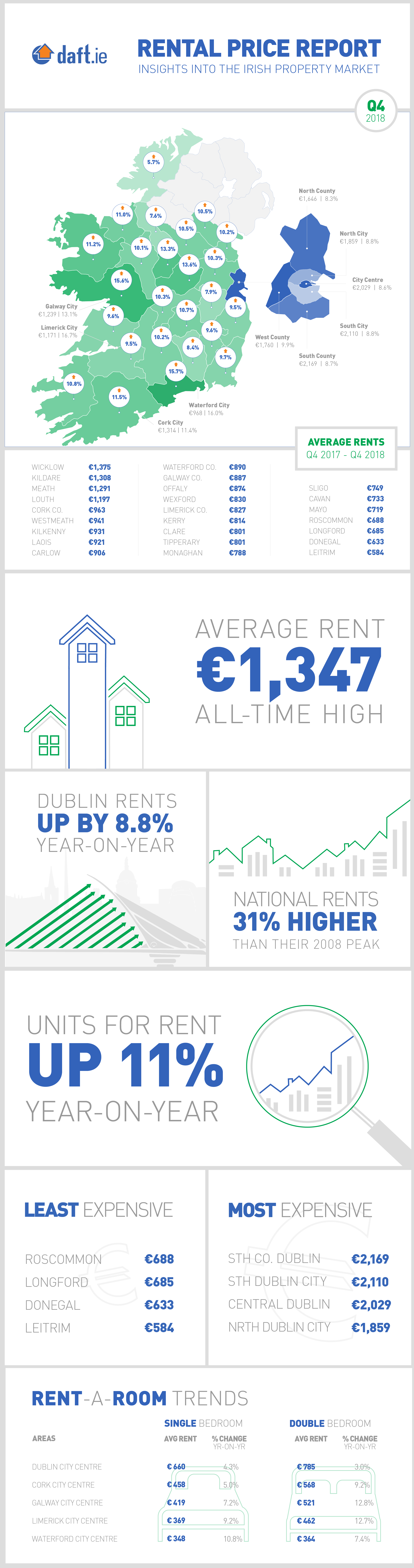 According to Daft.ie's latest quarterly Ireland Rental Report, while residential rents rose nationwide by an average of 9.8% in the year to December 2018.