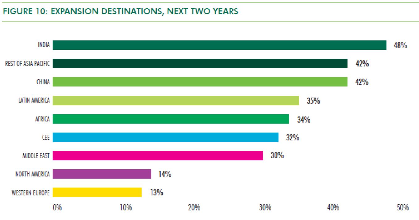 Of those surveyed, 48 percent named India as the location for expansion, double the amount from 2012. China was chosen by 42 percent, down from 60 percent the previous year.