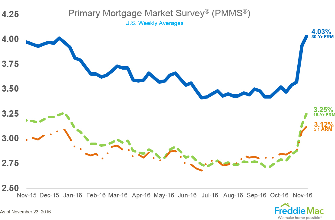 30-year fixed-rate mortgage (FRM) averaged 4.03 percent with an average 0.5 point for the week ending November 23, 2016, up from last week when it averaged 3.94 percent. A year ago at this time, the 30-year FRM averaged 3.95 percent.