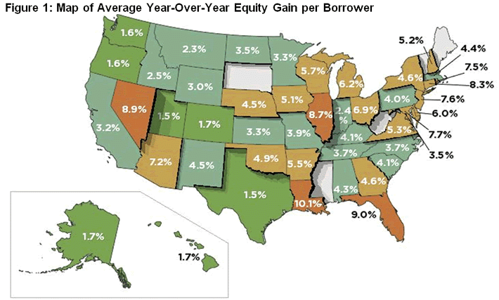 Additionally, homeowners gained an average of $14,888 in home equity between Q3 2016 and Q3 2017. Western states led the increase, while no state experienced a decrease. Washington homeowners gained an average of approximately $40,000 in home equity and California homeowners gained an average of approximately $37,000 in home equity.