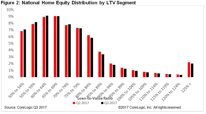 On a quarter-over-quarter basis, from Q2 2017 to Q3 2017, the total number of mortgaged homes in negative equity decreased 9 percent to 2.5 million homes, or 4.9 percent of all mortgaged properties. Year over year, negative equity decreased 22 percent from 3.2 million homes, or 6.3 percent of all mortgaged properties, from Q3 2016 to Q3 2017.