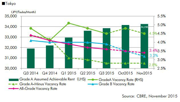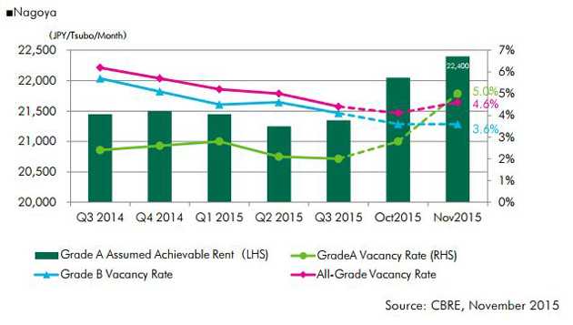 In November 2015 the Grade A office vacancy rate in Tokyo was down 0.3 points month-over-month (m-o-m) to 4.5%. Meanwhile, Osaka Grade A vacancy rate was flat at 5.0%, and the Nagoya Grade A vacancy rate was up 2.2 points to 5.0%.