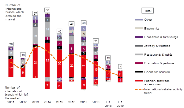 On the back of restrained consumer behavior the number of new international retailers declined sharply in H1 2019 with only seven brands entering the Russian market versus 15 in H1 2018. That includes three brands that debuted in Q2 2019 against five a year earlier. Over the past three months British premium men clothes retailer Hackett London opened its first store in Metropolis SC, premium sports clothes brand EA7 Emporio Armani appeared in MEGA Teply Stan SEC and luxury men clothes brand Off-White entered the market as a corner in TSUM. Beside that five brands left the Russian market in H1 2019 against four in H1 2018.