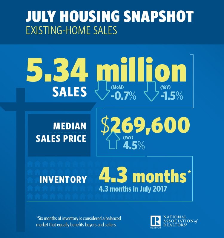 Single-family home sales declined 0.2 percent to a seasonally adjusted annual rate of 4.75 million in July from 4.76 million in June, and are 1.2 percent below the 4.81 million sales pace a year ago. The median existing single-family home price was $272,300 in July, up 4.6 percent from July 2017.