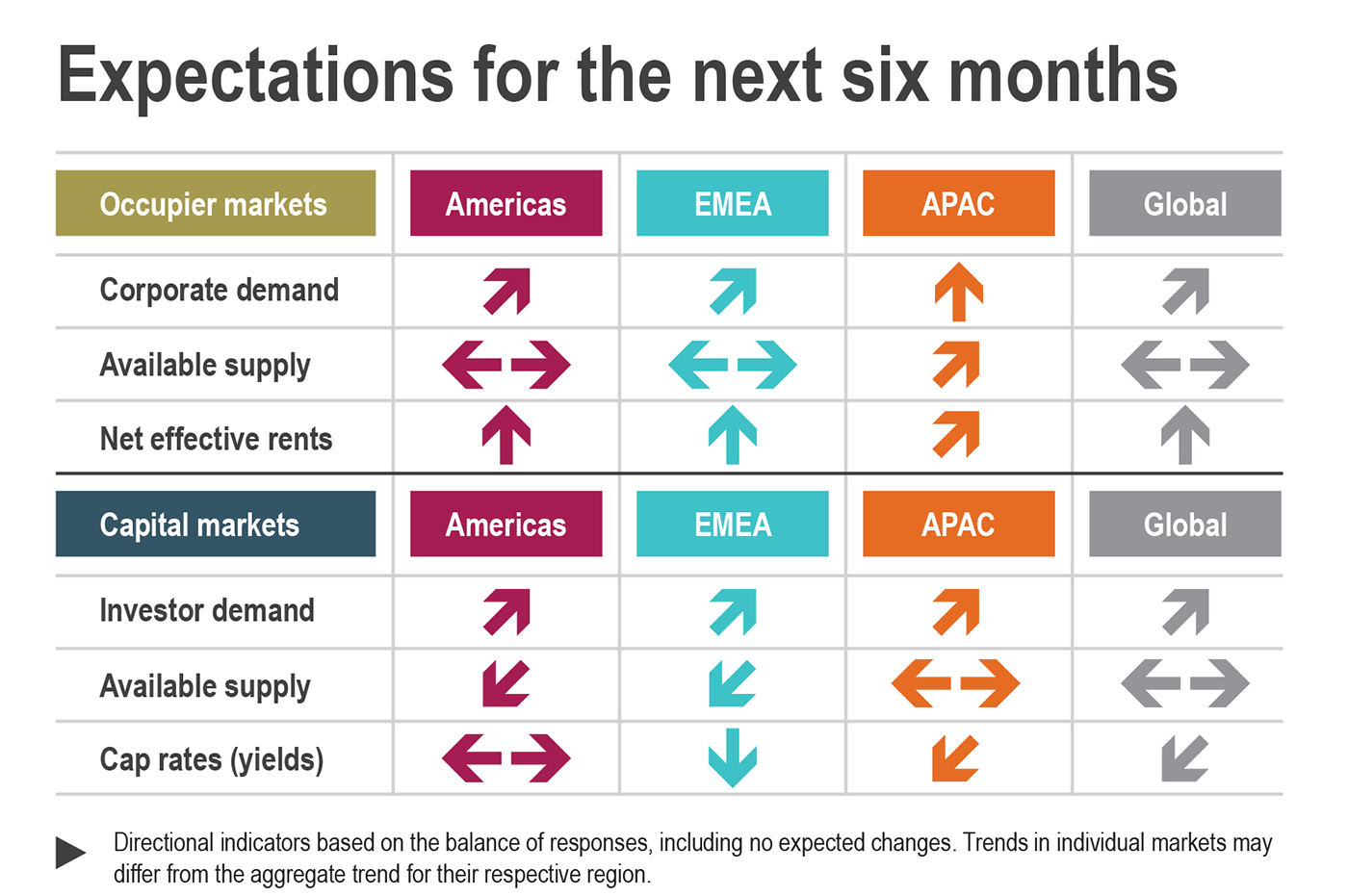 "Taking a look at the expectations for broad rental growth, institutional investor interest and the demand for new class A product, we can predict 2016 to be a promising year for corporate occupiers, investors and developers around the globe," explains Meyer. "We are seeing investor demand being spread more evenly throughout the three regions, indicating a very strong 'steady state' in the coming months."