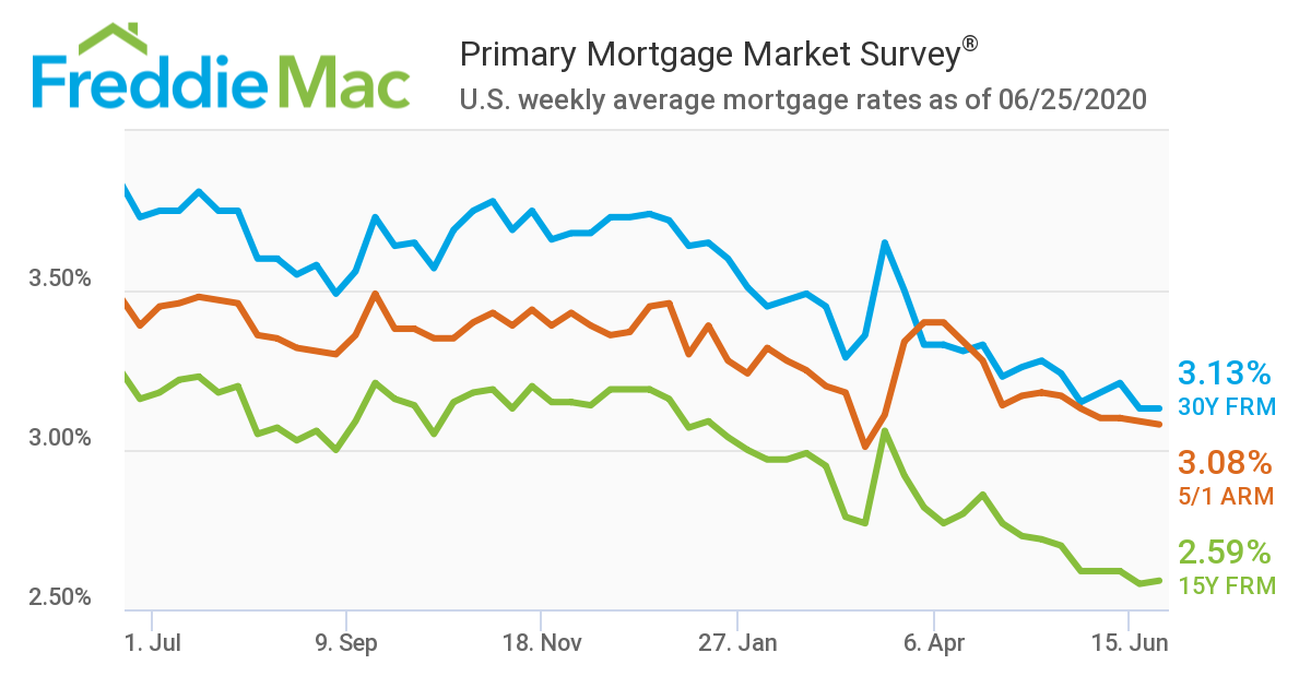 According to Freddie Mac's latest Primary Mortgage Market Survey, the U.S. 30-year fixed-rate mortgage (FRM) averaged 3.13 percent on June 25, 2020.