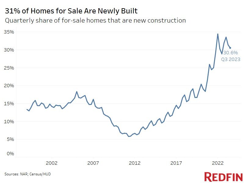 Based on new research by Redfin's data journalist Lily Katz, nationwide, 30.6% of U.S. single-family homes for sale in the third quarter were new construction. That's the highest share of any third quarter on record and up from 28.9% one year earlier and 25% two years earlier.