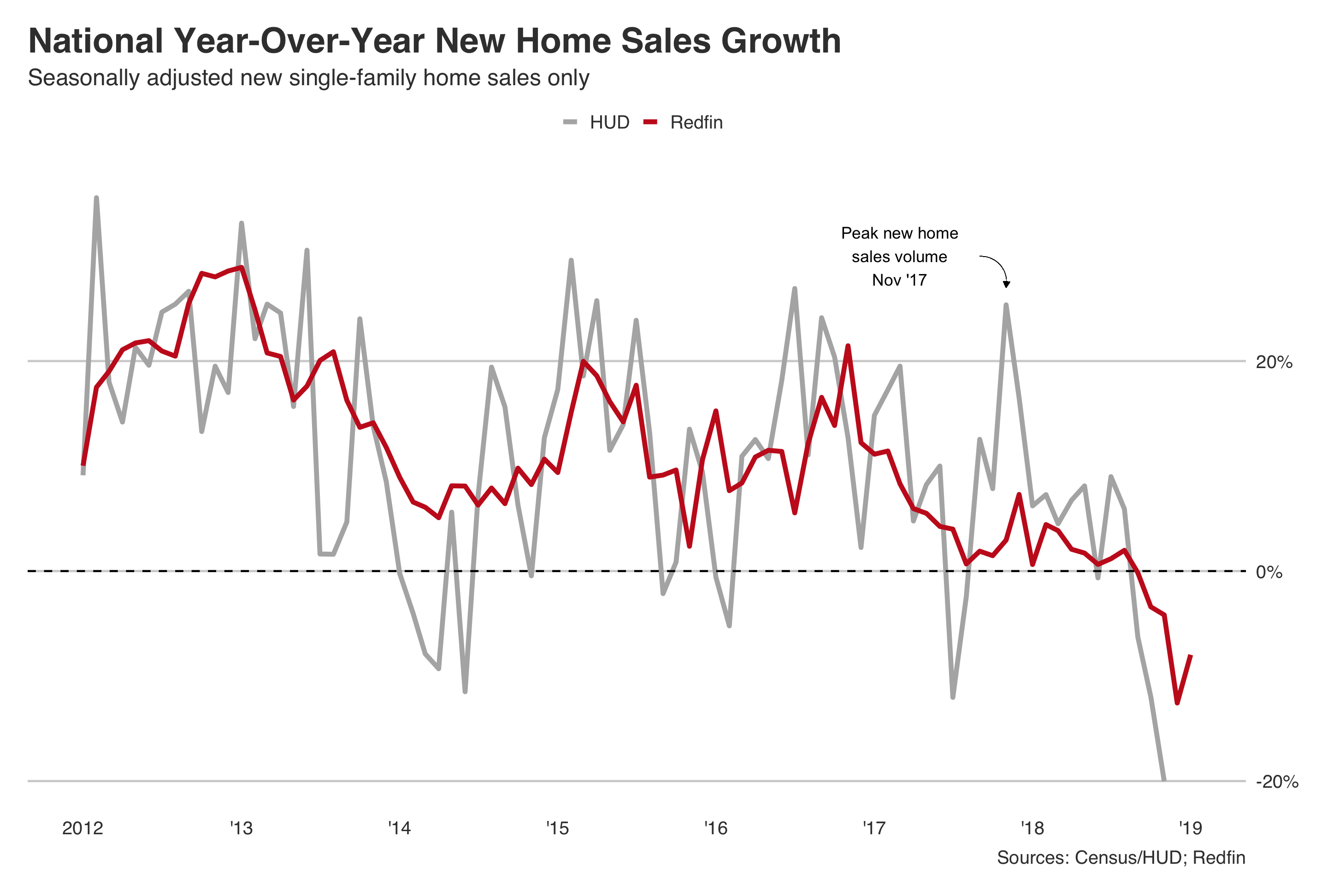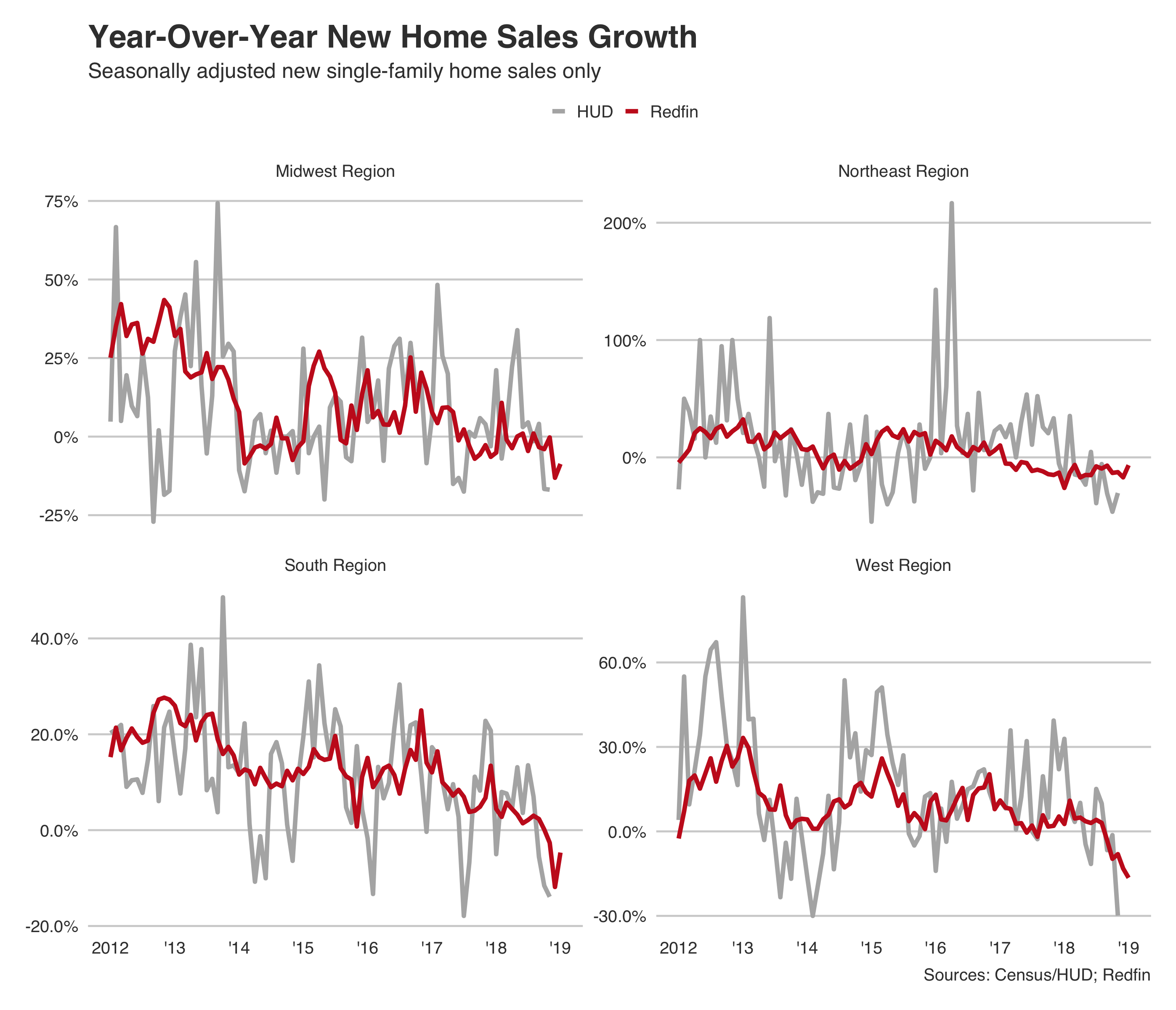The numbers above are based on Redfin data that covers more than 150 U.S. markets. The U.S. Department of Housing and Urban Development (HUD), in conjunction with the Census, typically reports monthly data on new-home sales, including year-over-year growth in sales and the statistics listed in the table above. Due to the partial government shutdown from December 22 to January 25, the data for the end of 2018 and the first month of 2019 hasn't been released. Redfin released November and December 2018 and January 2019 data on single-family new-home sales to bridge the gap as the effects of the shutdown continue. The charts below illustrate that overall, Redfin and HUD data show similar trends in new-home sales.