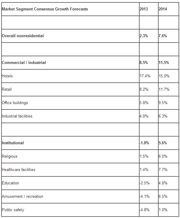 The projected growth in commercial and industrial projects remains unchanged, with an increase of 8.5 percent expected in 2013 and an 11.5 percent jump in 2014. The sector is expected to get a boost from a 17 percent increase in hotel development and an 8.2 percent increase in retail construction.